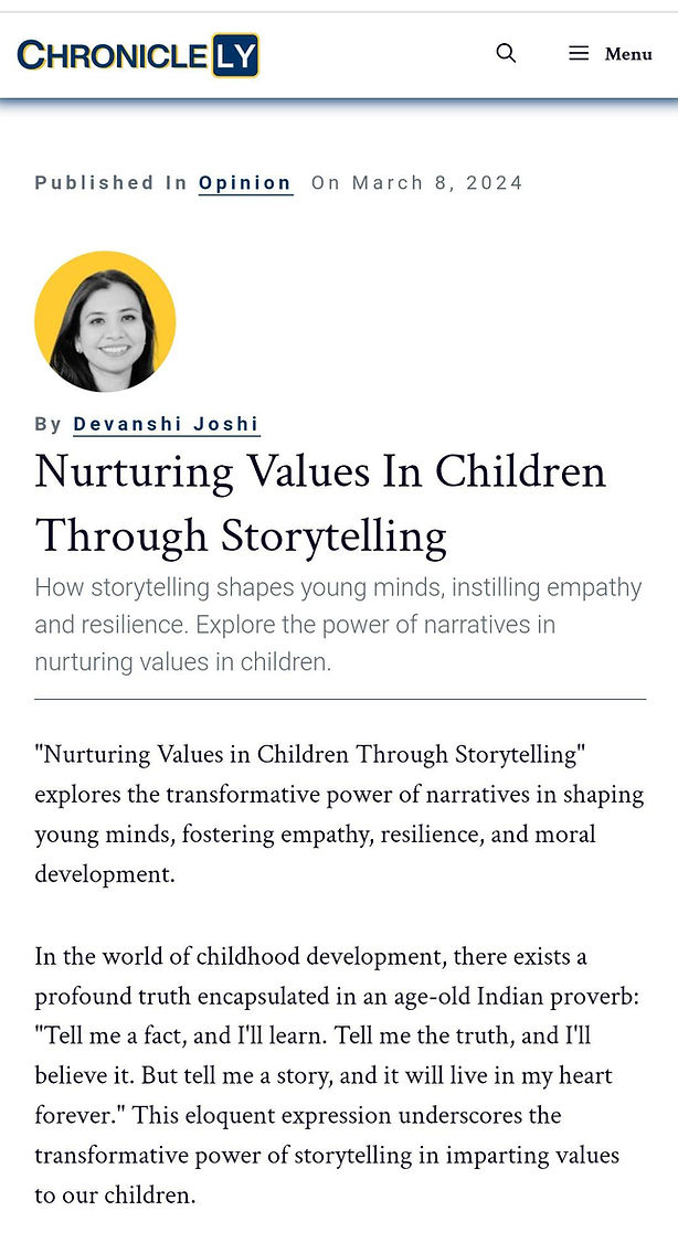 In the world of childhood development, there exists a profound truth encapsulated in an age-old Indian proverb: "Tell me a fact, and I'll learn. Tell me a truth, and I'll believe. But tell me a story, and it will live in my heart forever." This eloquent expression underscores the transformative power of storytelling in imparting values to our children.